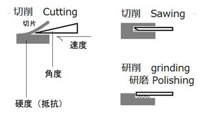※この工程は、基本的には木材や金属の加工技術と同じですが、対象が人を含む貴重な生物試料であるという特殊性から医学・生物学の狭い世界で独自に発展してきたため、少しやり方や用語が異なっています。 Cutting:最も基本的な作製法で、鉋(カンナ)で表面を”削る”イメージ。実は斧(オノ)のように刃先を被削材に食い込ませて”裂く、割る”に近い。切片の状態は刃の角度、衝突速度、試料の硬度(切削抵抗)に影響されるが、あまり硬いものには適さない。 Sawing:鋸(ノコギリ)で”切る”イメージ。実は刃先で”削る”わけで、削り取られた部分だけ試料は消耗しており、切片を重ねても元の大きさにはならない。硬い(弾性の低い)ものに適している。 Lapping:鑢(ヤスリ)で”削る”イメージ。削りながら薄くしていく方法で、試料の損耗が多い。GrindingとかPolishingとも呼ばれ、Sawing後の切り口の仕上げにも用いられるが、慣用的に一括して「研磨標本」と呼ばれている。 |